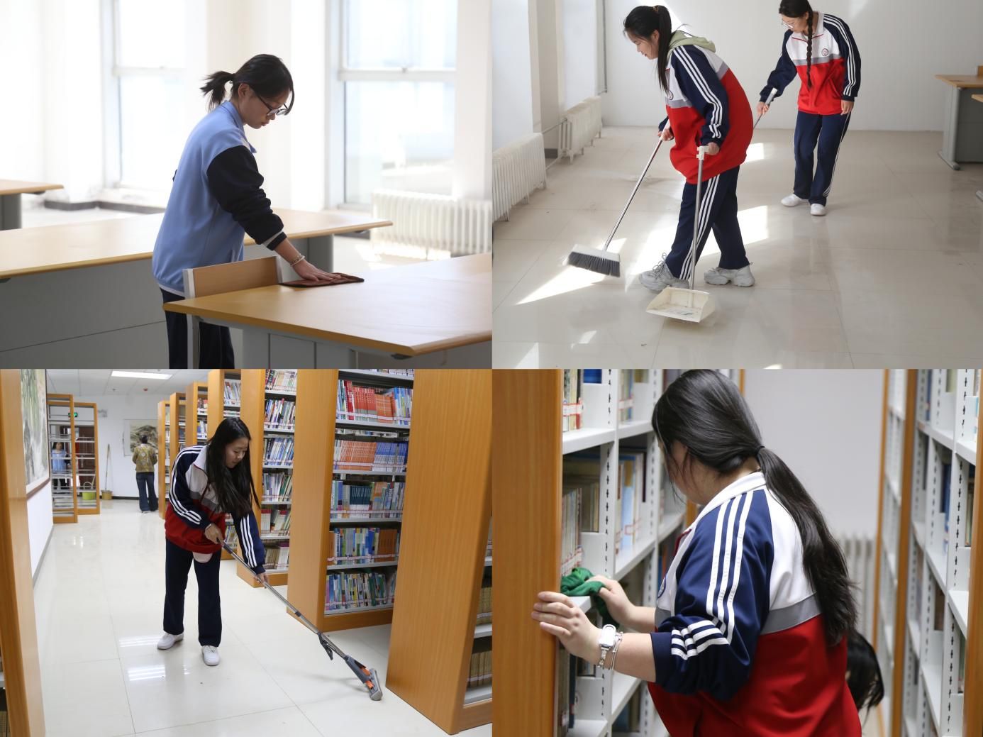 随后,志愿者队伍前往图书馆,继续开展志愿服务。图书馆内,大家分工协作、有序忙碌:有的负责清扫地面、拖净角落污渍,让阅读环境清爽整洁;有的细心擦拭馆藏标识牌、书架扶手,抹去细微灰尘;还有的主动整理散落书籍、规范摆放报刊杂志,帮助读者快速找到所需资料。