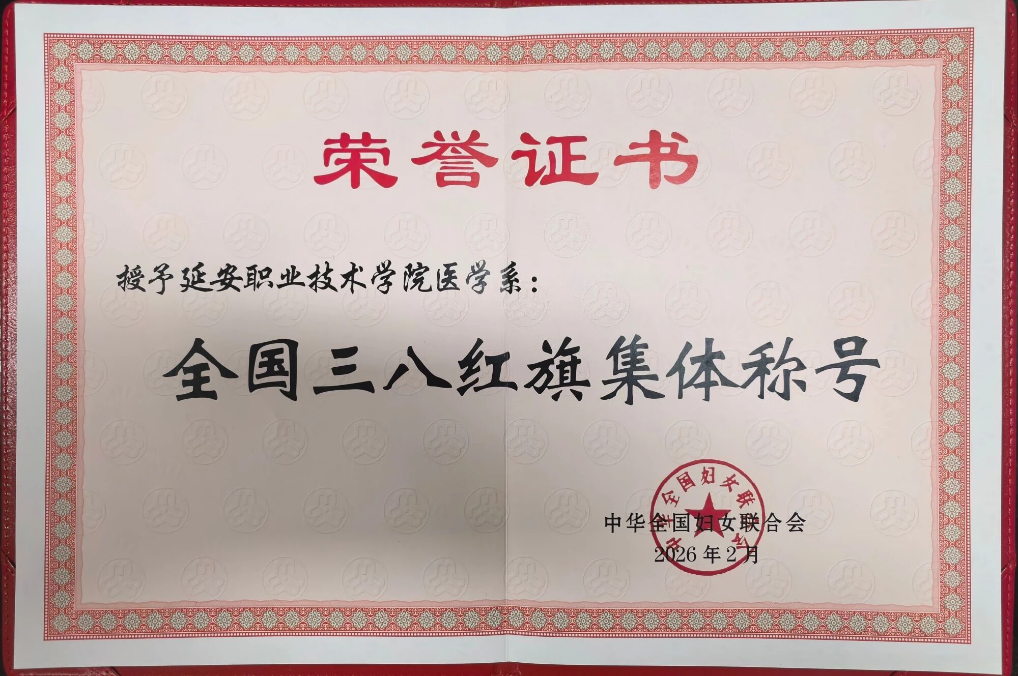 大会以“跟党奋进新征程 巾帼建功新时代”为主题,隆重表彰了2025年度全国三八红旗手、全国巾帼文明岗、全国三八红旗集体等先进个人和集体,充分展现了三秦大地女性的时代风采与担当。在本次表彰中,延安职业技术学院医学系荣获“2025年度全国三八红旗集体”称号。